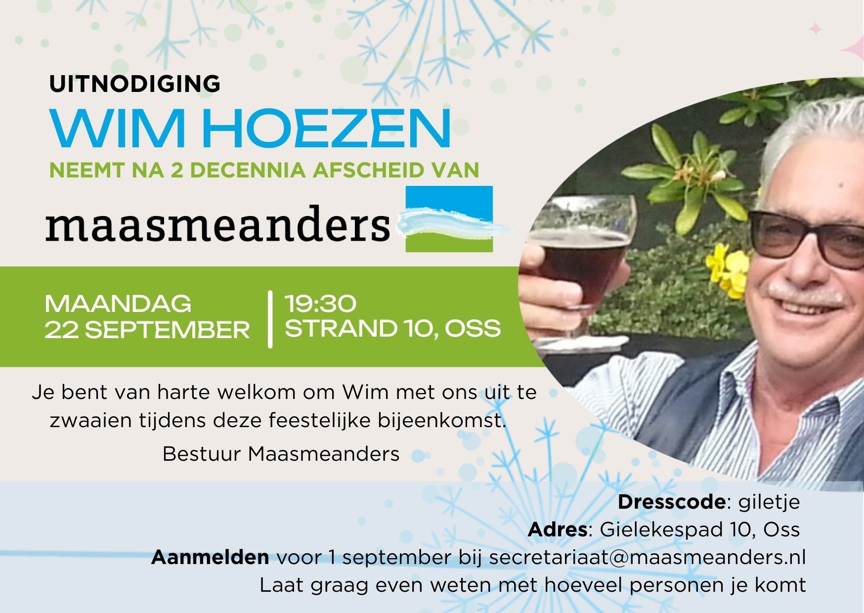 ‘Mr. Maasmeanders’ Wim Hoezen neemt na ruim 20 jaar afscheid als bestuursondersteuner van stichting Maasmeanders. Ontelbare fietskaarten maakte hij en bracht hij rond, hij bezocht veel van onze leden, hij praatte als Brugman voor het behoud van de pontjes, had eindeloos overleg bij gemeenten en provincies en was en is zeer betrokken bij al het moois in ons Maasmeander gebied. Op 22 september staan we daar graag op feestelijke wijze bij stil. We zouden het heel erg waarderen als veel van onze relaties en zeker de leden van Maasmeanders Wim mee komen uitzwaaien. Het wordt een gezellige avond bij Strand Tien in Oss. Om dit goed voor te bereiden horen we graag of u deze avond aanwezig bent en met hoeveel personen. Mail daarvoor aan secretariaat@maasmeanders.nl.